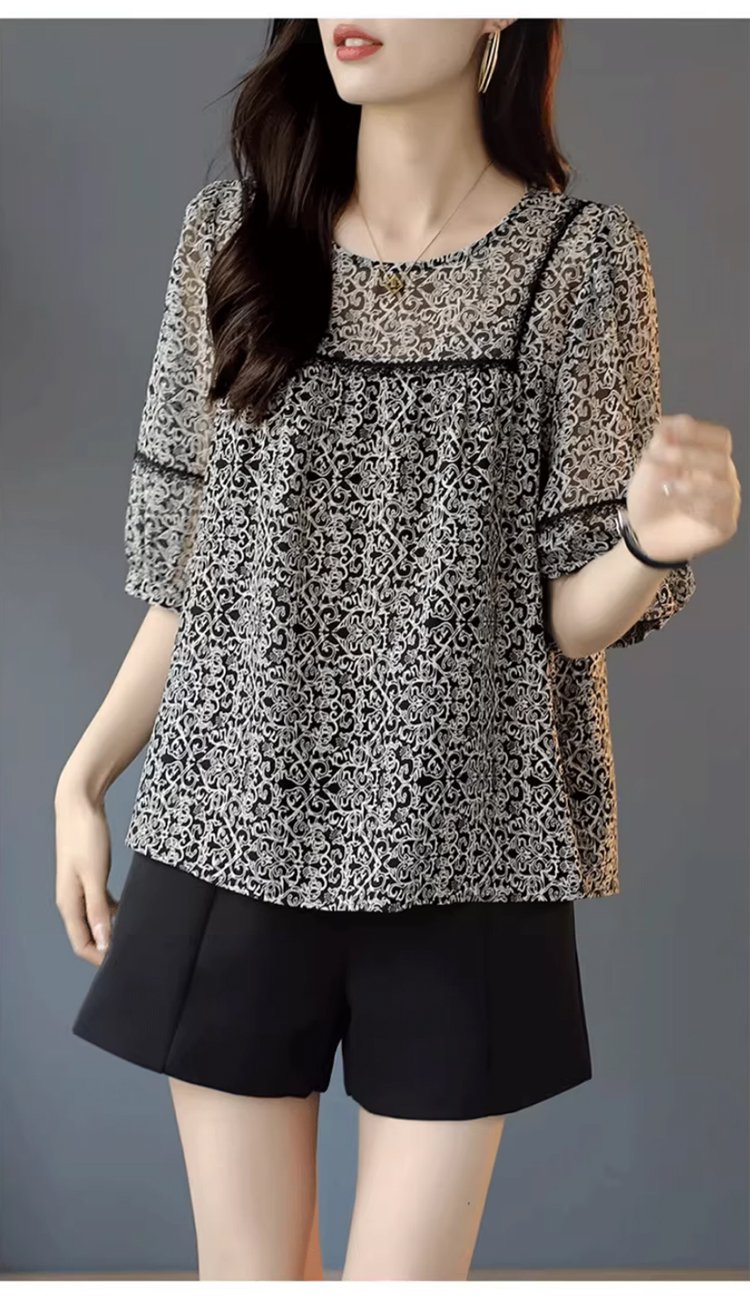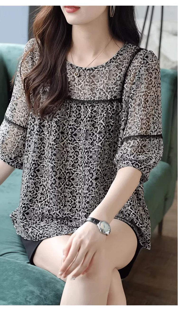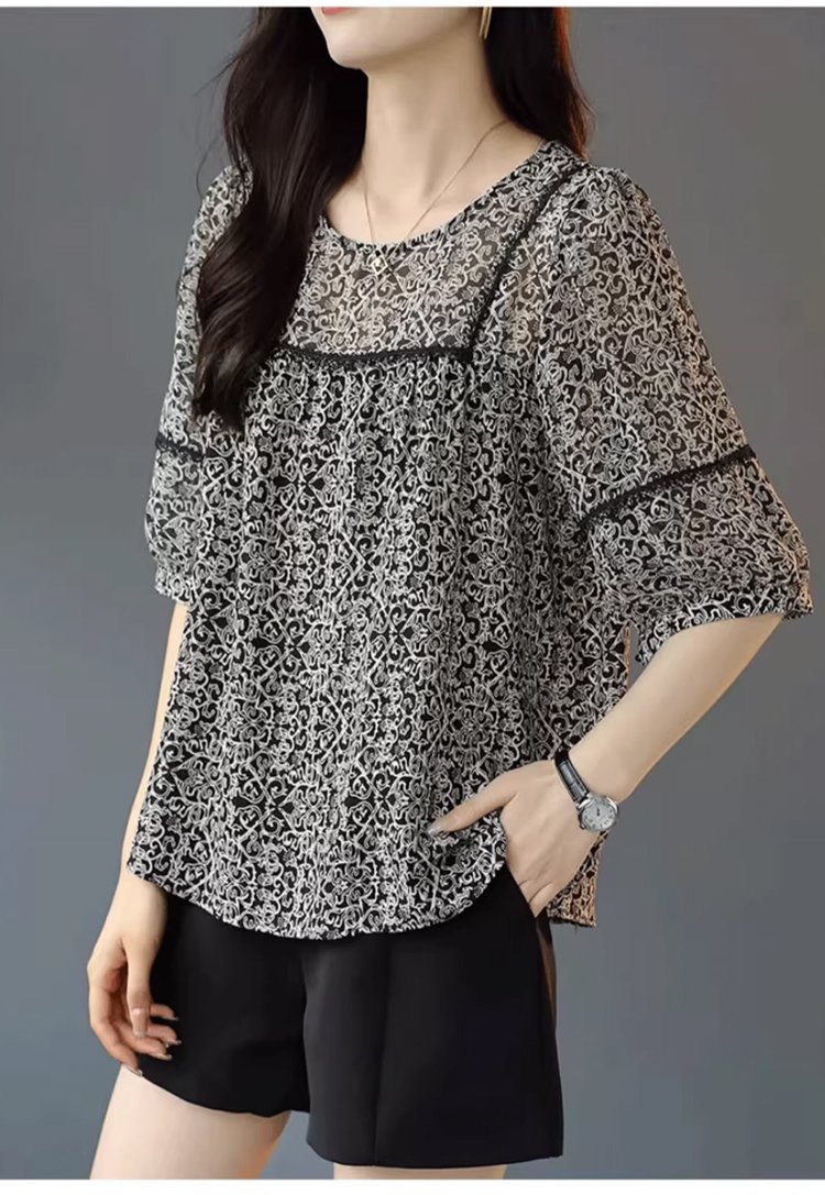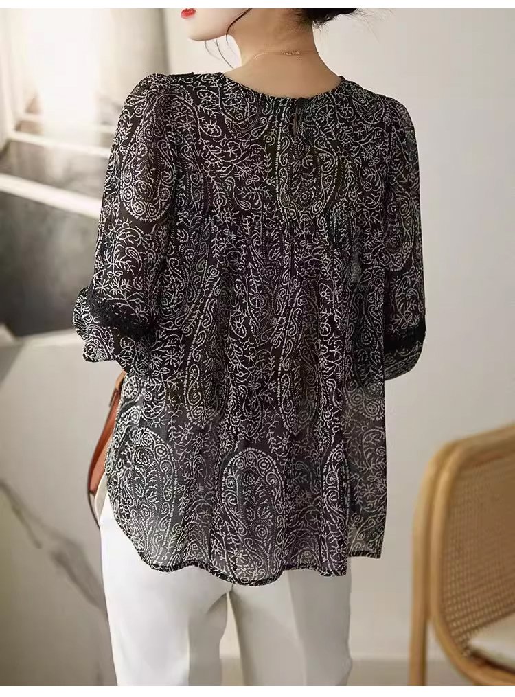 레이스 배색 프린트 쉬폰 블라우스