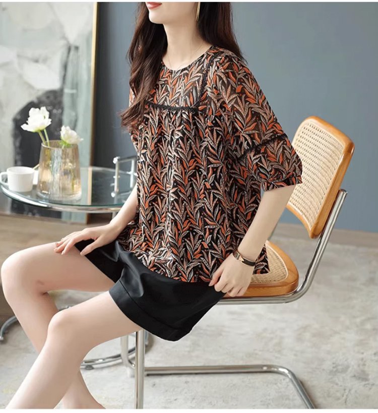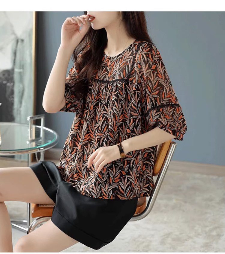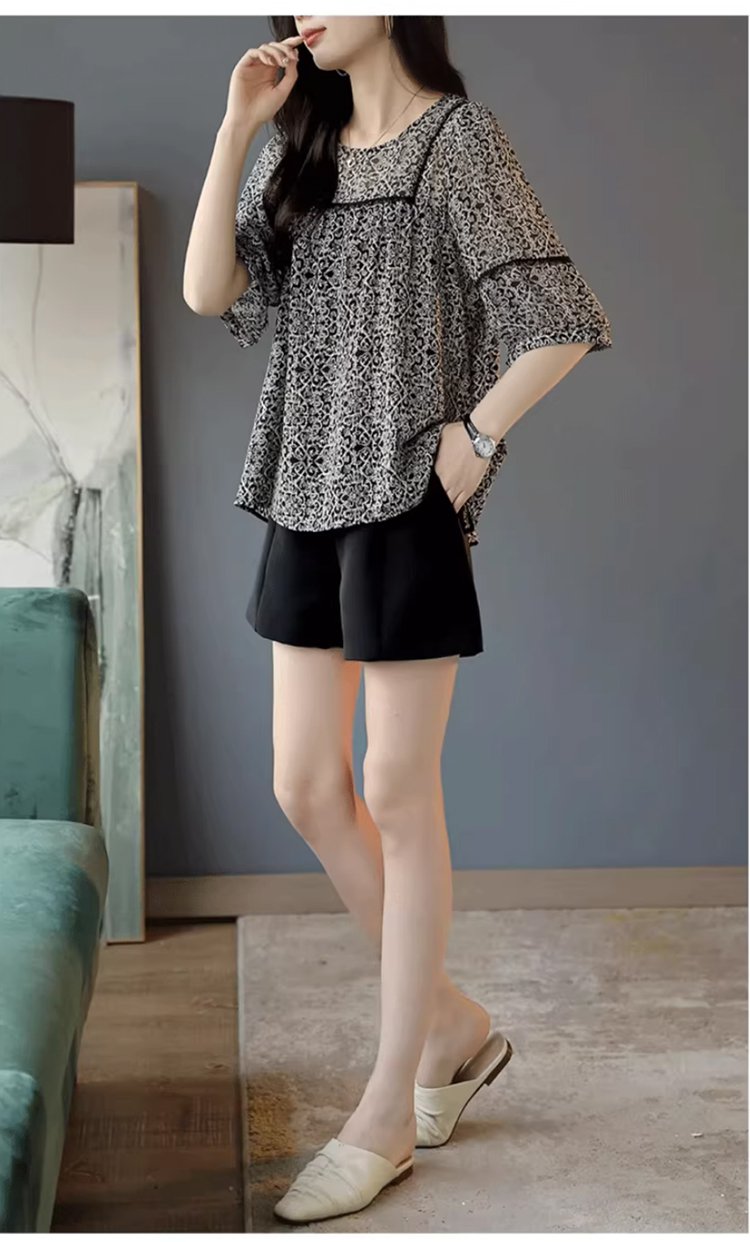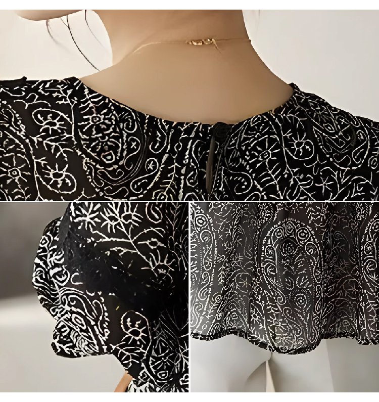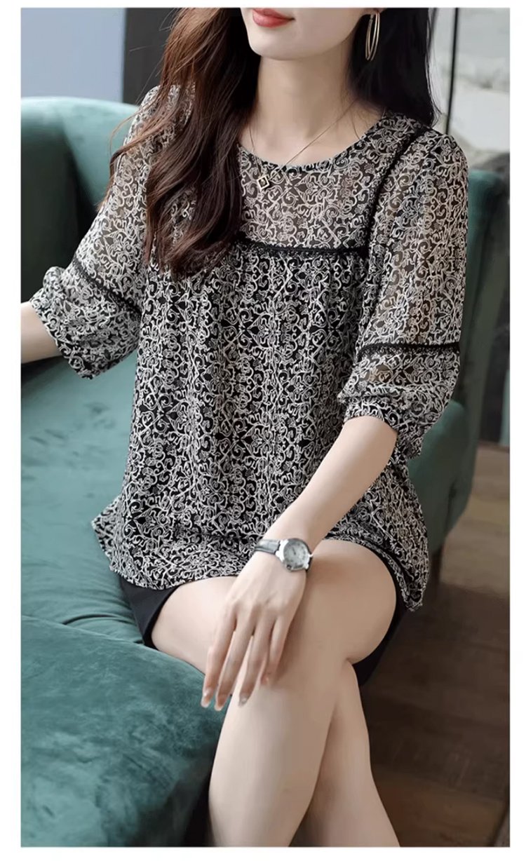 레이스 배색 프린트 쉬폰 블라우스