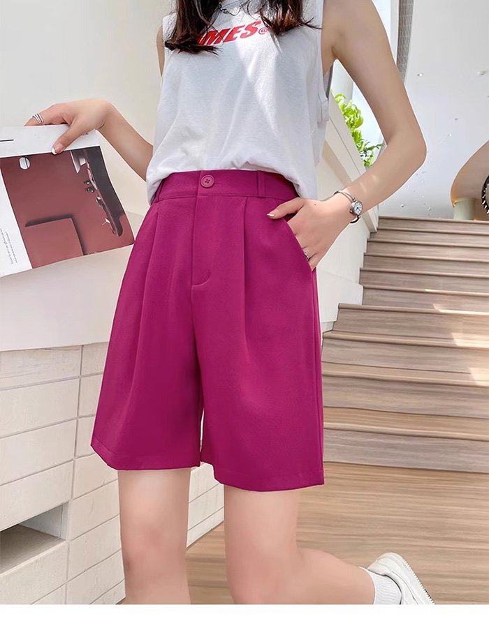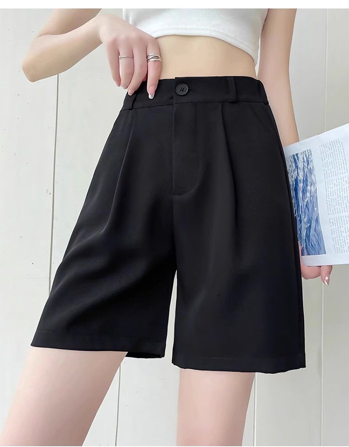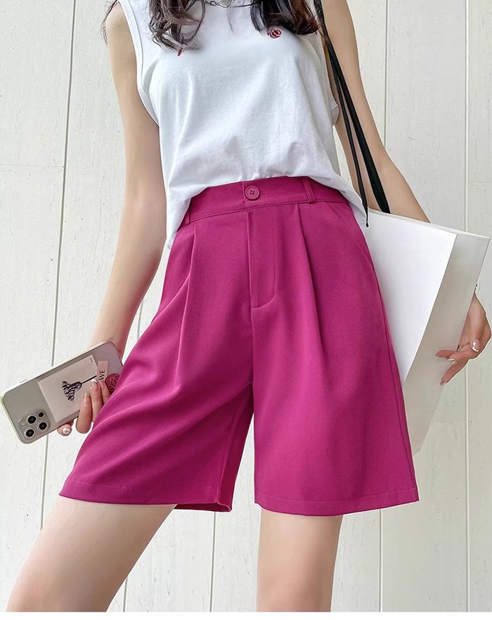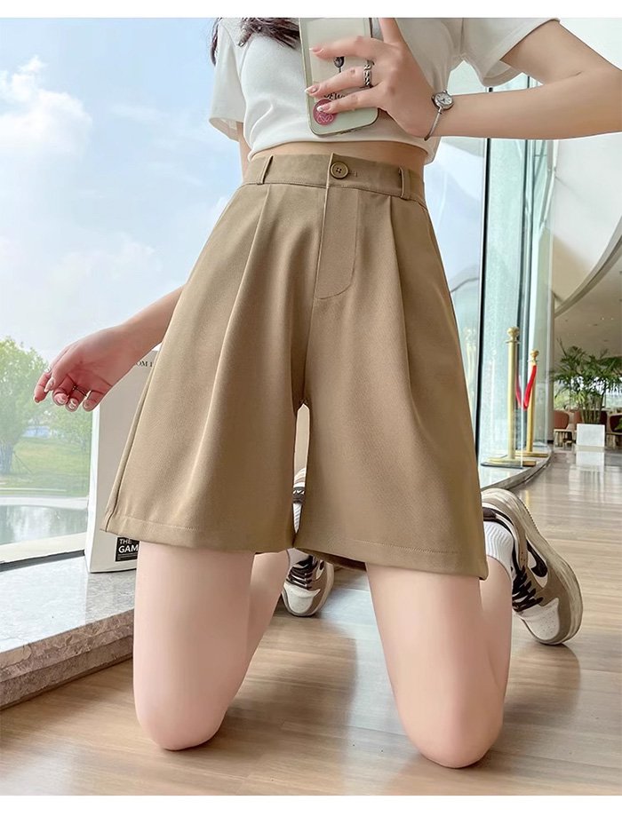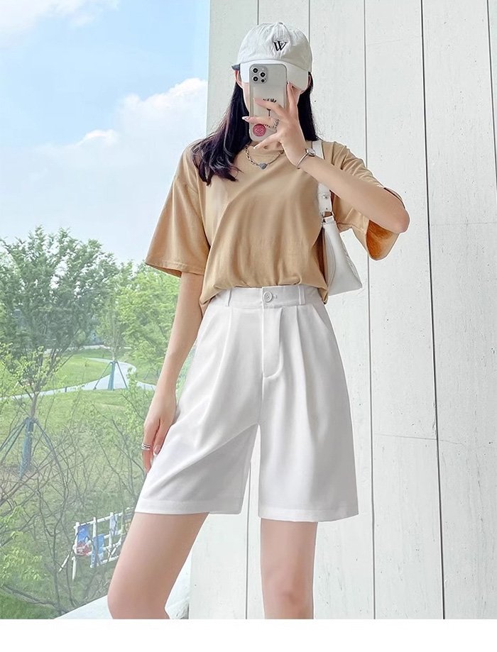 여성이 착용한 하이웨스트 와이드 5부 팬츠 스타일링